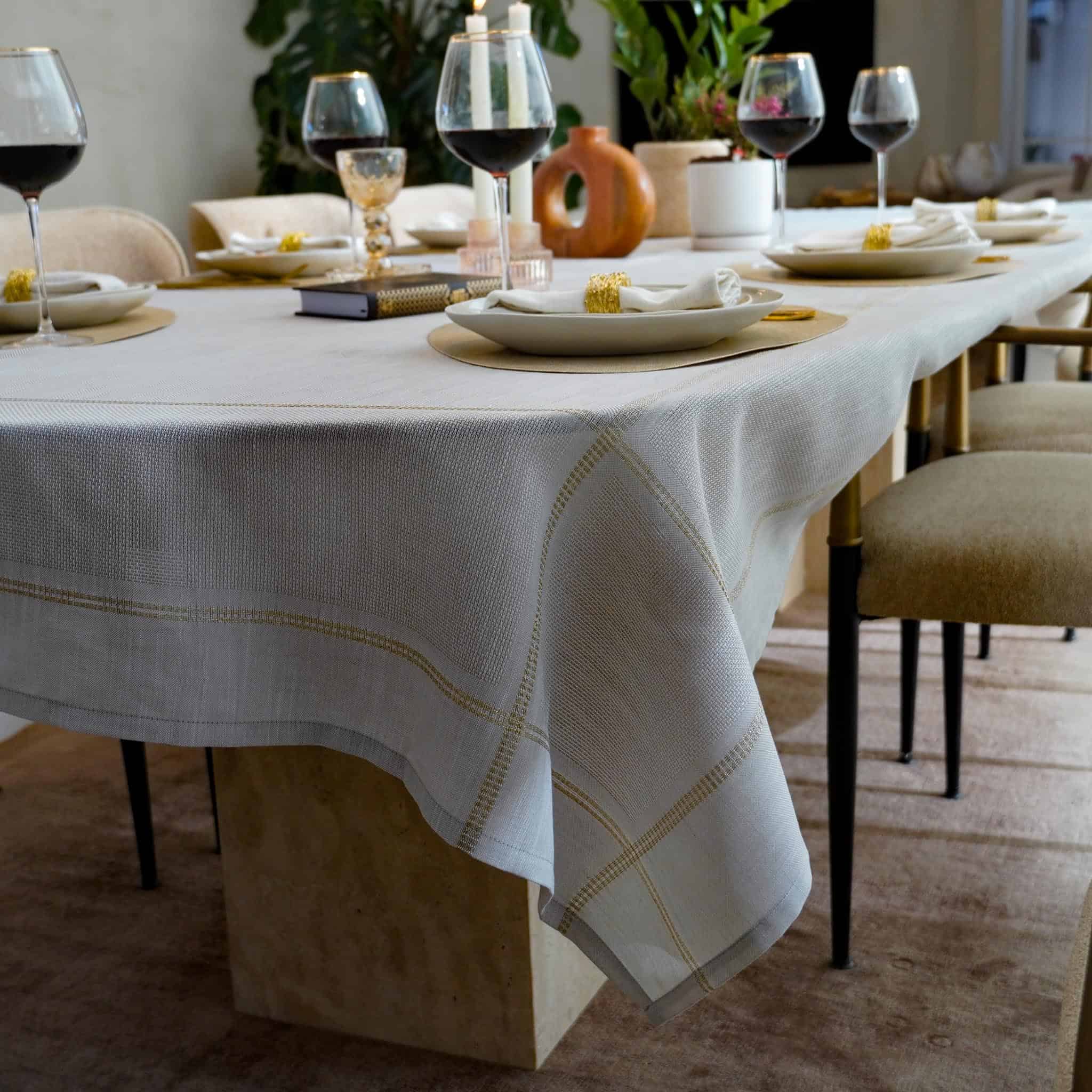 מפת שולחן אבישג עשויה בד ג’קארד איכותי במראה דמוי פשתן טבעי, המשלב עיצוב אלגנטי עם שימושיות יומיומית.